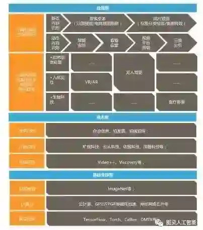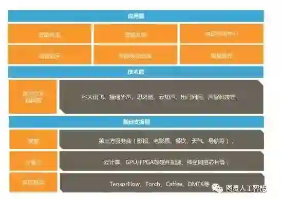 基础层:包含大数据、计算力和算法三块,其中大数据等接入的是相应领域的第三方服务商。机器在识别人类的语音指令后接入、提供相应的服务。诸如影视、电影票、餐饮等;