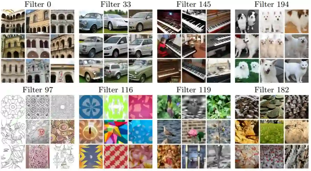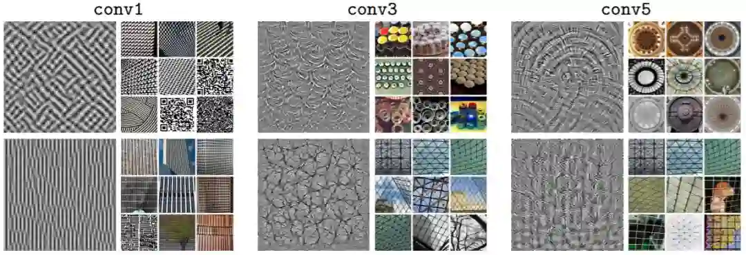 图 4:滤波器可视化和来自 YFCC100M 的 100 万个图像子集中的前 9 个激活图像,用于在 ImageNet 上使用深度聚类训练的 AlexNet 的 conv1、conv3 和 conv5 中的目标滤波器。滤波器的可视化是通过学习一个输入图像来获得的,该图像最大化目标滤波器的响应 [64]。