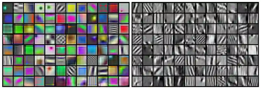 图 3:在原始 RGB 输入 (左) 或 Sobel 滤波 (右) 之后,在无监督的 ImageNet 上训练的 AlexNet 的第一层滤波器的卷积结果。