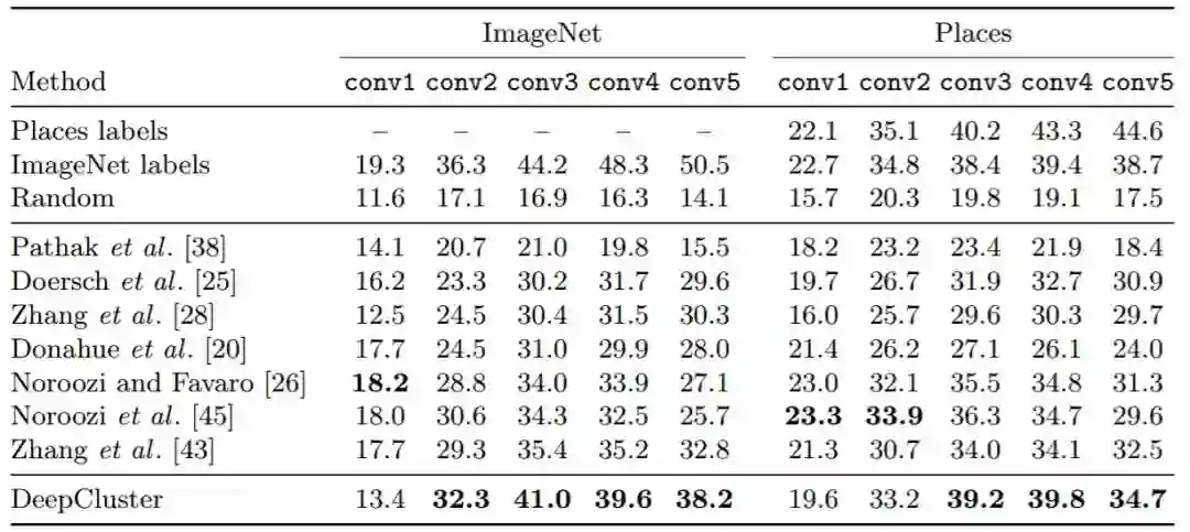 无监督学习在机器学习社区 [12] 中得到了广泛的研究,在计算机视觉应用中也经常使用聚类、降维或密度估计算法 [13,14,15]。例如,「特征包」模型使用手工标注的描述符的聚类来生成良好的图像级特征 [16]。它们取得成功的一个关键原因是,它们可以应用于任何特定的领域或数据集,如卫星或医学图像,或使用一种新的模态 (如物体深度) 获取的图像,在这种模式下,无法获得大量的标注。有几项研究表明,可以将基于密度估计或降维的无监督方法应用到深度模型中 [17,18],从而产生良好的通用视觉特征 [19,20]。尽管聚类方法在图像分类方面取得了初步的成功,但很少有人提出将其用于对卷积网络进行端到端训练 [21,22],而且未成规模。问题是,聚类方法主要是为固定特征的线性模型设计的,如果必须同时学习特征,那么它们几乎不起作用。例如,使用 k-means 学习一个卷积网络将得到零特征的平凡解,并且聚类会坍缩成单个实体。