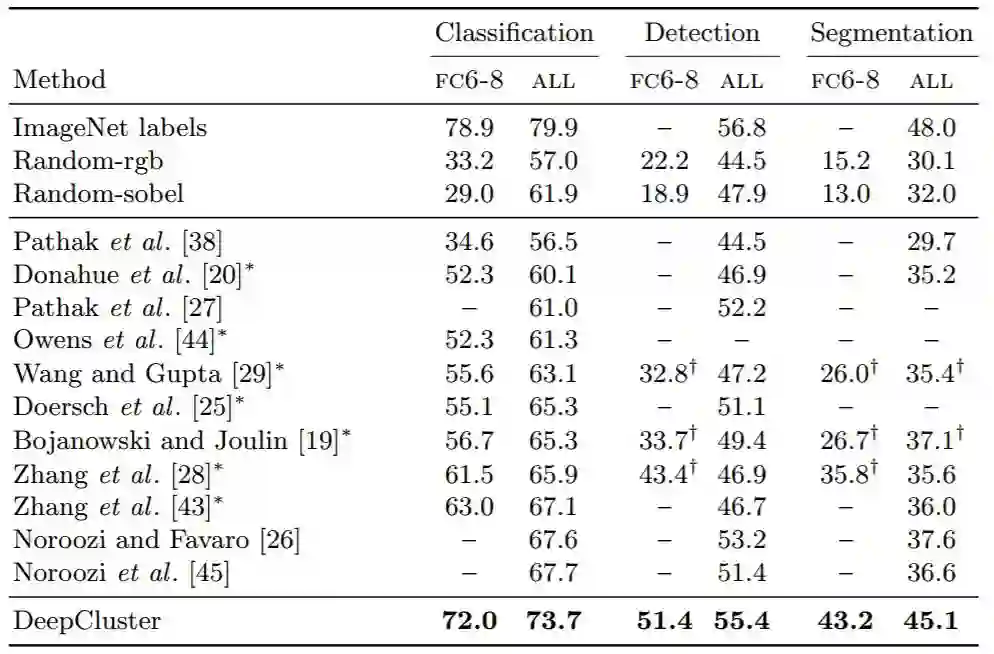 表 2:对 Pascal VOC 的分类、检测和分割的最新无监督特征学习方法的比较。∗表明 Krahenbuhl 等人使用数据依赖初始化 [68]。其他方法产生的数字被标记为 a †。
