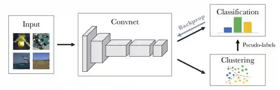图 1:本文提出方法的图示:对深层特征进行迭代地聚类,并使用聚类赋值作为伪标签来学习卷积网络的参数。