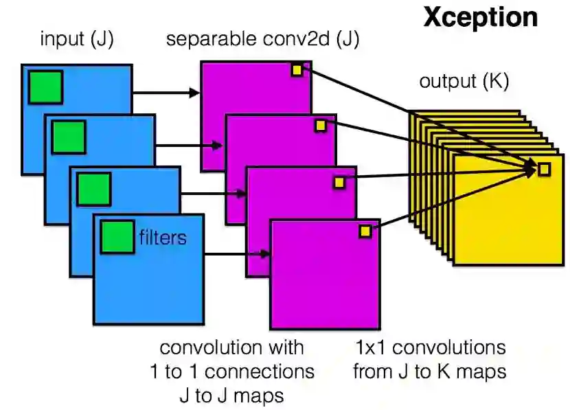 Xception 则把分组卷积的思想发挥到了极致,每一个通道单独分为一组。利用了 depthwise separable convolution,如下图所示,J 个输入通道,每个通道用一个单独的空间卷积核卷积(比如 3x3),J 个卷积核得到 J 个输出通道,然后再用 K 个卷积核对上一步得到的 J 个输出通道进行 1x1 的普通卷积,得到 K 个最终的输出: