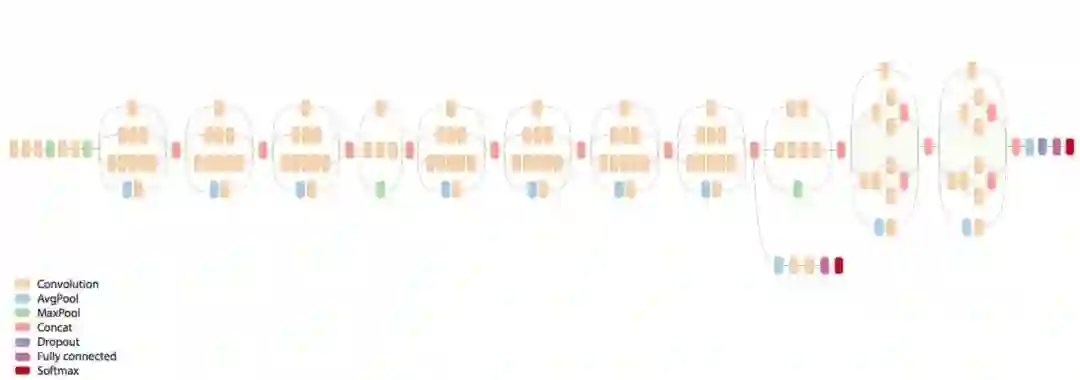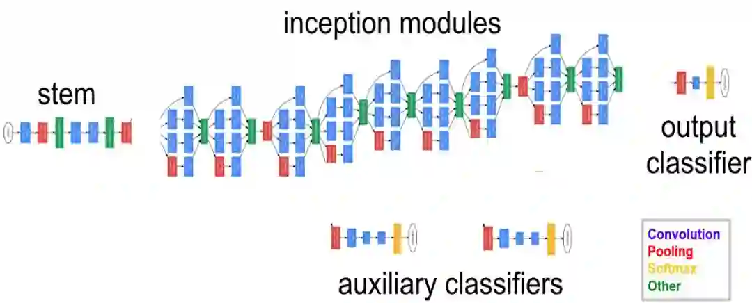 网络总体结构如下所示,包含多个上面的 Inception 模块,并添加了两个辅助分类分支补充梯度更好训练: