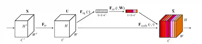 除了上面介绍的久经考验的网络以外,还有各种各样的新的网络,比如 NASNet、SENet、MSDNet 等等。其中,SENet 的 Squeeze-Excitation 模块在普通的卷积(单层卷积或复合卷积)由输入 X 得到输出 U 以后,对 U 的每个通道进行全局平均池化得到通道描述子(Squeeze),再利用两层 FC 得到每个通道的权重值,对 U 按通道进行重新加权得到最终输出(Excitation),这个过程称之为 feature recalibration,通过引入 attention 重新加权,可以得到抑制无效特征,提升有效特征的权重,并很容易地和现有网络结合,提升现有网络性能,而计算量不会增加太多。