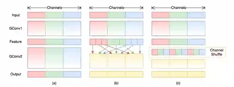 Xception 已经做得很好了,但是 1x1 那里太耗时间了成了计算的瓶颈,那就分组啦较少计算量,但是分组了,组和组之间信息隔离了,那就重排 shuffle 一下,强行让信息流动。具体的网络结构如上图左侧所示。channel shuffle 就是对通道进行重排,将每组卷积的输出分配到下一次卷积的不同的组去: