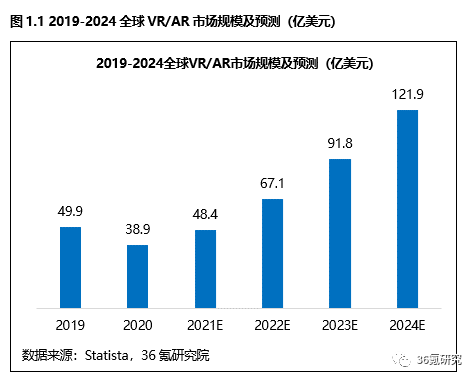 2021年元宇宙火遍全球,直接推动了VR/AR产业的发展。根据Statista预测,2024年全球VR/AR市场规模或将突破121亿美元。VR/AR快速发展的同时,背后问题也在不断凸显:内容质量低、沉浸体验差、成本偏高等依旧需要参与者共同解决。