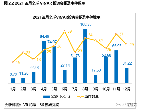 2021年,全球投资金额高峰发生在4、5及8月,主要受Epic Games10亿美元战略融资、Snap5亿美元收购WaveOptics、字节跳动90亿收购Pico等事件影响。其中,8月为全年投资热度最高的月份,金额突破108亿元。