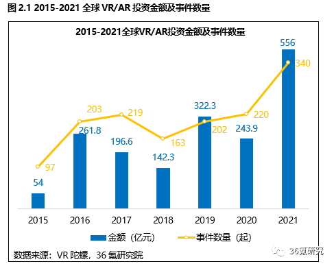 2016年被称为VR元年。根据VR陀螺数据,2016年全球VR/AR领域投资金额与数量出现小高峰,分别达261.8亿元和203起。然而VR/AR技术并未实现革命性突破,眩晕与延时体验痛点仍存,因而资本渐趋理性,投资热度有所回落。2021年居家隔离带动终端用户对真实世界沉浸式体验需求的上升,再叠加元宇宙概念的“一夜爆红”,VR/AR成为投资风口,全年共发生340起投资事件,投资金额高达556亿元,同比增长128%。