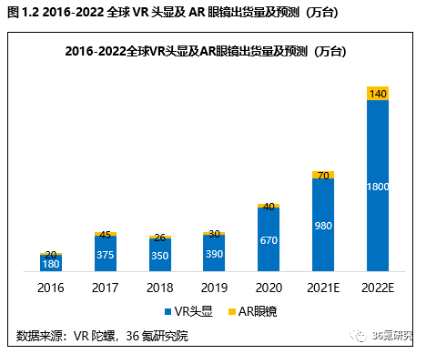 四大细分市场中,硬件直接触达终端消费者,为用户带来沉浸式立体感观体验。VR陀螺数据显示,2016年,以VR头显及AR眼镜为代表的两大设备出货量为200万台;2020年出货量实现超2倍增长,达710万台,其中包括670万台VR头显及40万台AR眼镜。这一数字有望在2021年突破千万大关并于2022年达到2千万。硬件设备出货量的增长成为全球VR/AR市场扩容的强大助力。
