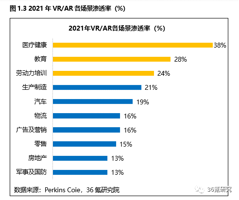 与此同时,VR/AR商业化落地场景渐趋多元。除游戏、娱乐等大众熟知的应用场景外,VR/AR逐渐涉足医疗、教育、生产制造等新领域,行业渗透率也在不断提升。根据Perkins Coie数据,2021年VR/AR在医疗健康、教育、劳动力培训、生产制造场景中的渗透率已超20%,其中医疗健康渗透率高达38%。