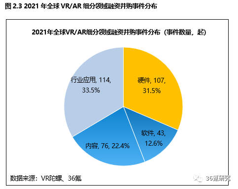分领域而言,2021年全球行业应用领域实现114起投资事件,占比33.5%,其次为硬件、内容及软件,事件数量分别为107、76及43起。