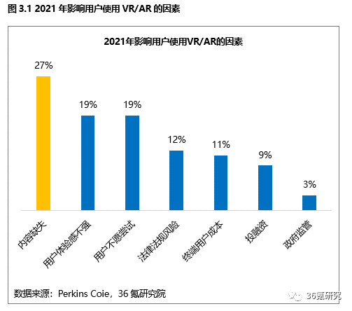 过往几年,尽管VR/AR受到众多投资者青睐,但其规模化应用尚未真正实现。根据Perkins Coie调研,从终端用户角度而言,制约其选择VR/AR设备的主要原因有内容、体验感、成本等要素。其中,27%用户认为目前VR/AR相关内容质量不高、数量有限且可获取性不强,而现象级内容更是凤毛麟角;19%用户表示VR/AR沉浸式体验仍有较大提升空间,头显设备过重、佩戴眩晕、数据传输延时等问题亟待突破。
