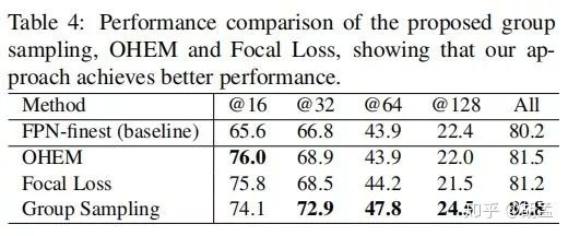 3 本文提出group sampling,实现简单,确保了不同anchor尺度上正负样本的比例分布比较均衡,最终对检测性能有了较大的提升;