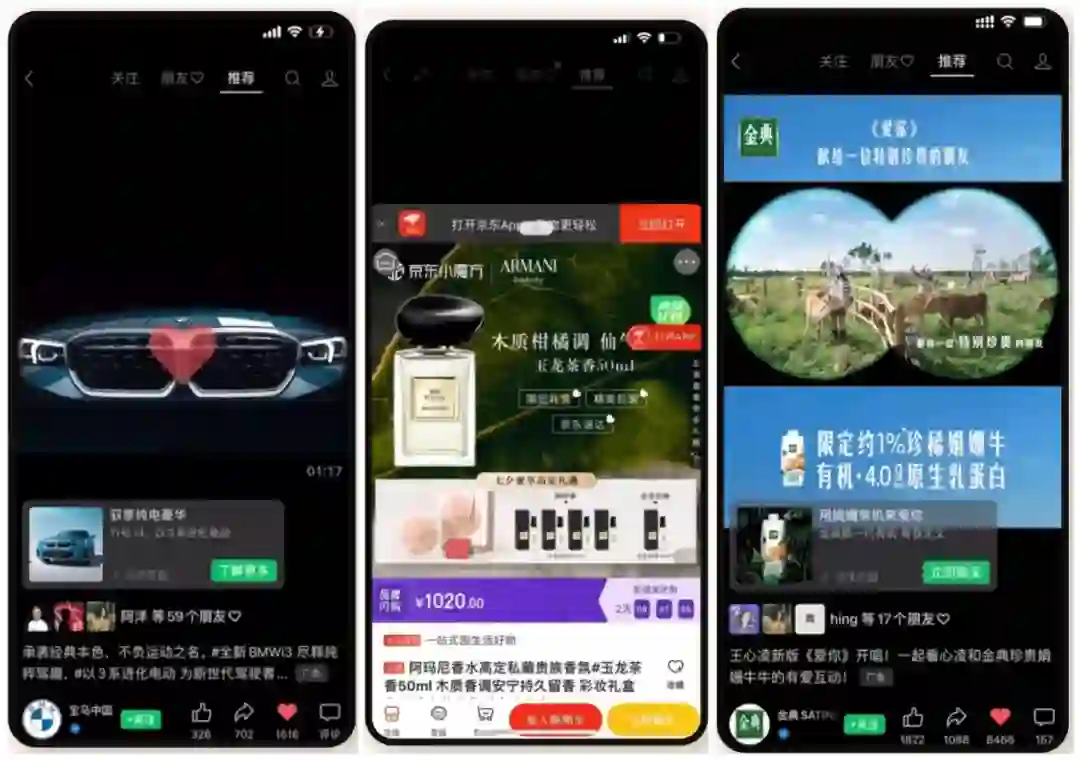 据悉,目前该功能还在内测阶段。根据广告效果演示图,目前已有宝马、阿玛尼和金典牛奶三家启动了视频号信息流广告投放。
