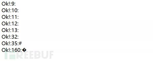 可以发现,除了我们刚刚使用的0x0a,0x0b,0x0c,0x0d外还有9号与160号字符可以替换空格(32号本身就是空格,35是注释符不能查询获得正确结果,9号是tab,刚刚漏了,至于160号字符为什么行,我也不知道,那位哥如果知道可以告诉大家)。