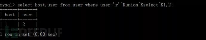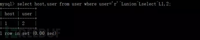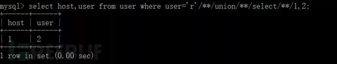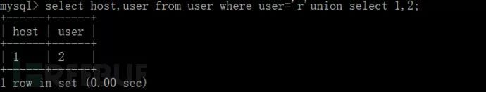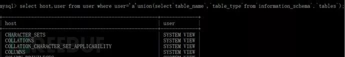 select host,user from user where user='a'union(select`table_name`,`table_type`from`information_schema`.`tables`);