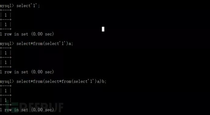 select*from(select*from(select*from(select*from(select'1')a2)a3)a4)a5