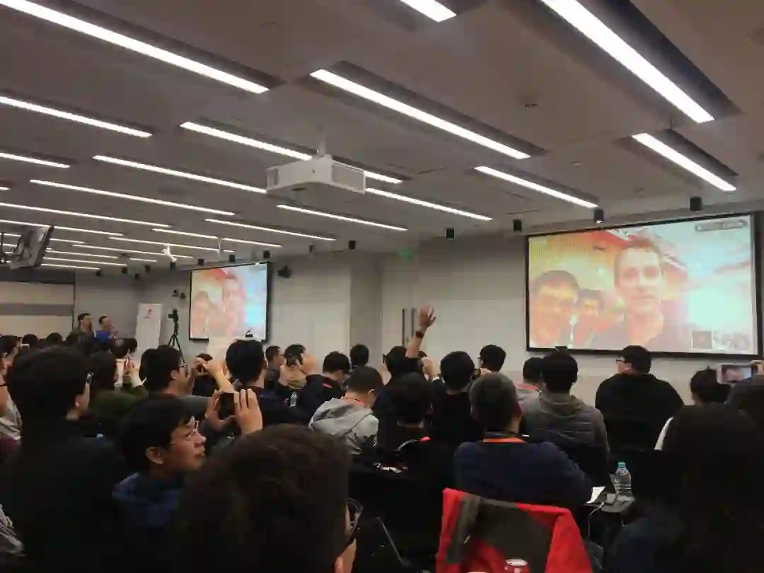 在中国,TensorFlow 社区活动非常丰富。比如,这是三月底在谷歌北京办公室举办的 TensorFlow 开发者峰会北京分会场活动,凌晨 1 点,Jeff Dean 和 TensorFlow 中国开发者视频互动的场景:
