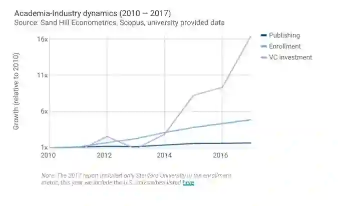 为了探索 AI 分别在学界和业界的趋势之间的关系,我们首先从前边内容中选取了一些有代表性的测量指标,尤其是 Scopus 上的 AI 论文发表情况、美国多所大学的入门级 AI 课程注册情况,以及 AI 初创公司的融资情况。