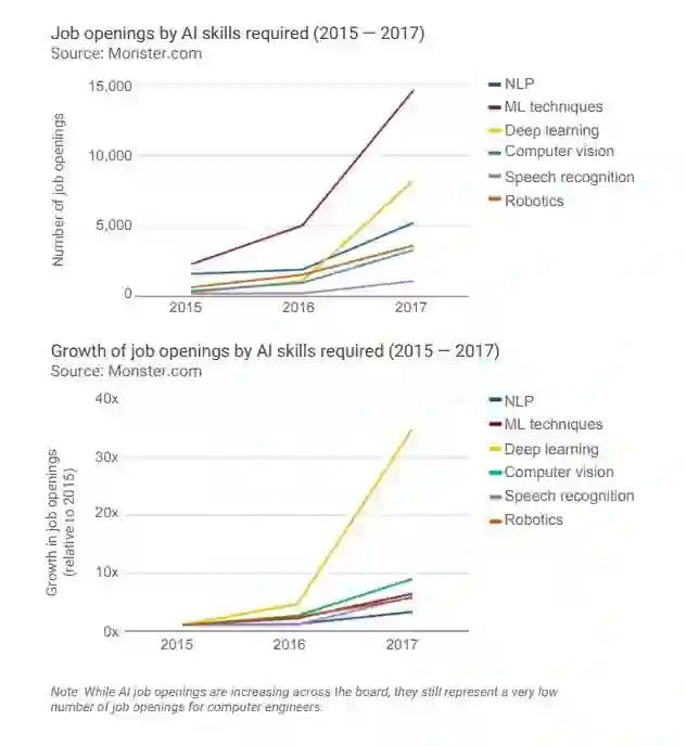 深度学习的需求在 2015 年—2017 年经历高速增长,相关岗位数量增加了 35 倍。