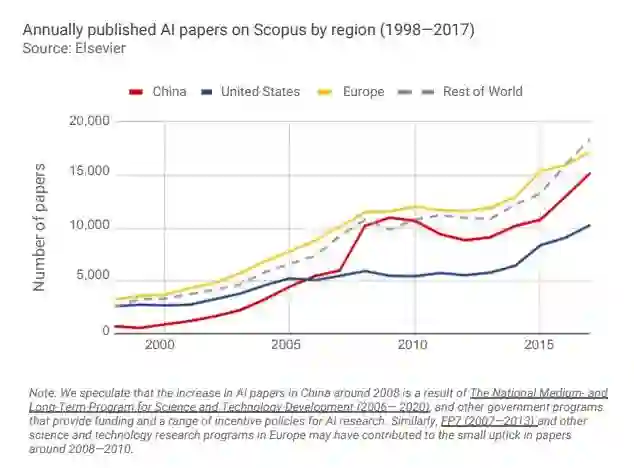 紧随其后的中国在 2017 年产出全球 25% 的 AI 论文,AI 论文发表数量与 2007 年相比,增幅将近 150%(尽管 2008 年前后曾出现异常波动)。