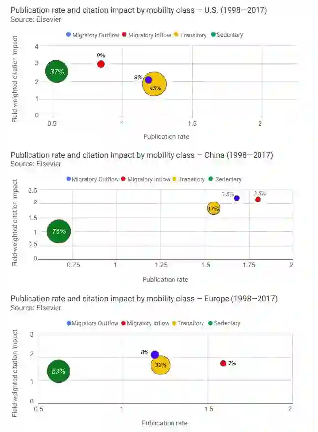 无论是美国、中国还是欧洲,迁移类学者(包括流入迁移与流出迁移)的论文引用影响力(FWCI)都是最高的。这说明经常流动的学者往往拥有更多的论文引用,并倾向于频繁发表论文。
