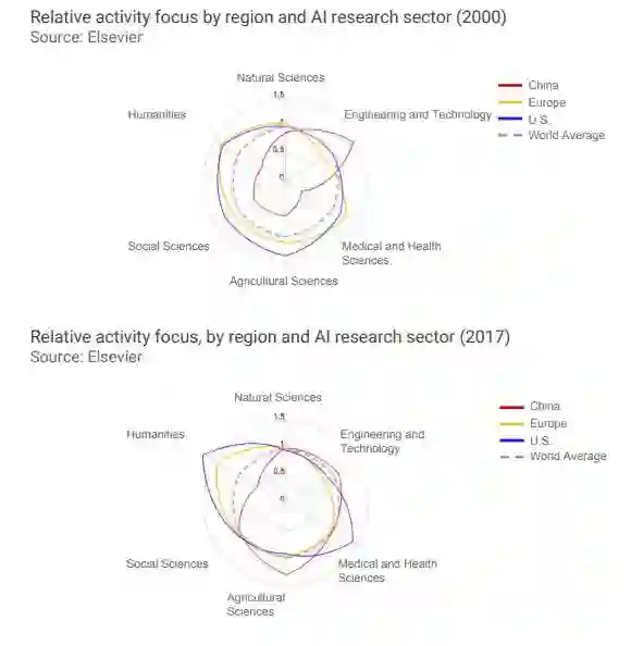 与 2000 年相比,这三个地区的领域 AI 专业水平在 2017 年都有明显提升,其中中国的侧重领域转向了农业科学。中国的转变基本符合我们的预期,因为它是世界上最大的食品生产国,同时倾向于将研究重点放在 AI 应用上。