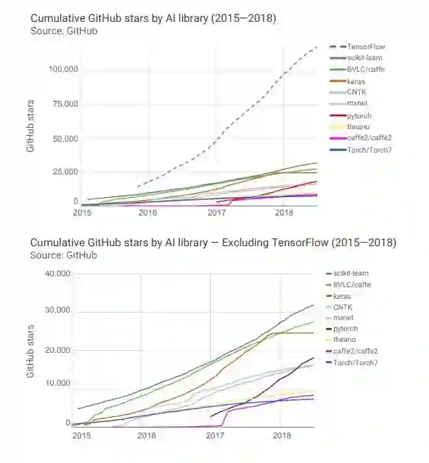 下图展示了不同 AI 和 ML 软件包在 GitHub 上的星标数量,从中可以初步判断不同 AI 编程框架的流行程度。
