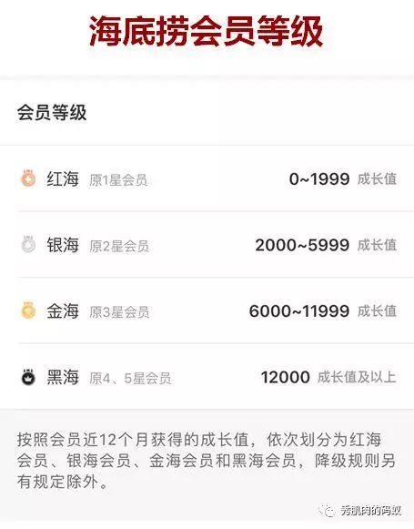 店员:海底捞采用成长值,成长值等于近12个月成长总数值+近12个月就餐次数*100。红海会员成长值为0-19999,银海会员成长值为2000-5999,金海会员成长值为6000-11999,黑海会员成长值为12000。