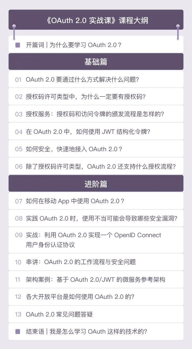 我将课程分为「基础篇」和「进阶篇」两大模块,每个模块都有大量实践内容,让你彻底搞懂并且用好 OAuth 2.0。