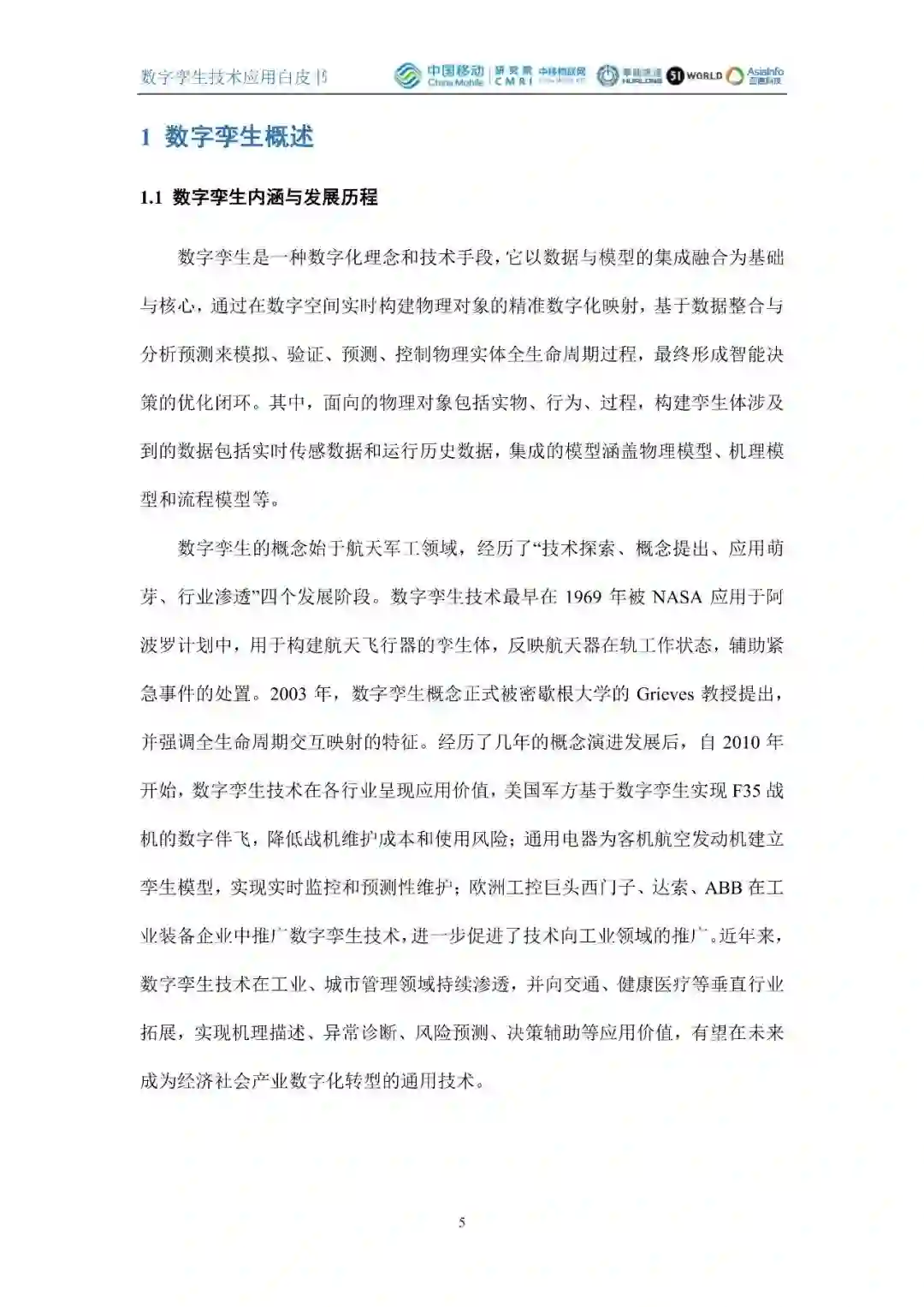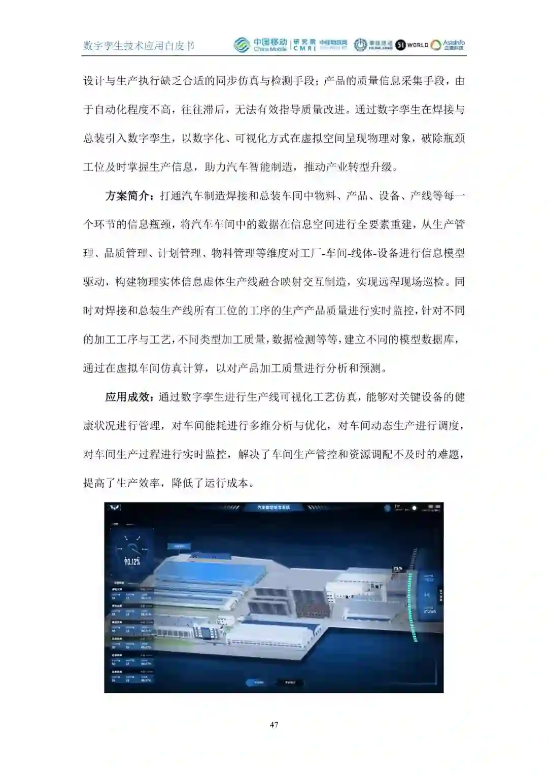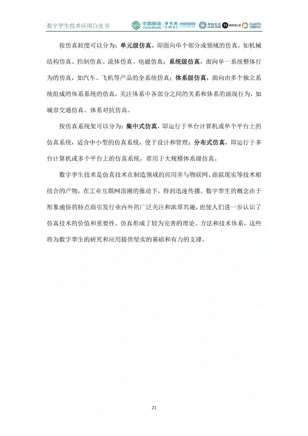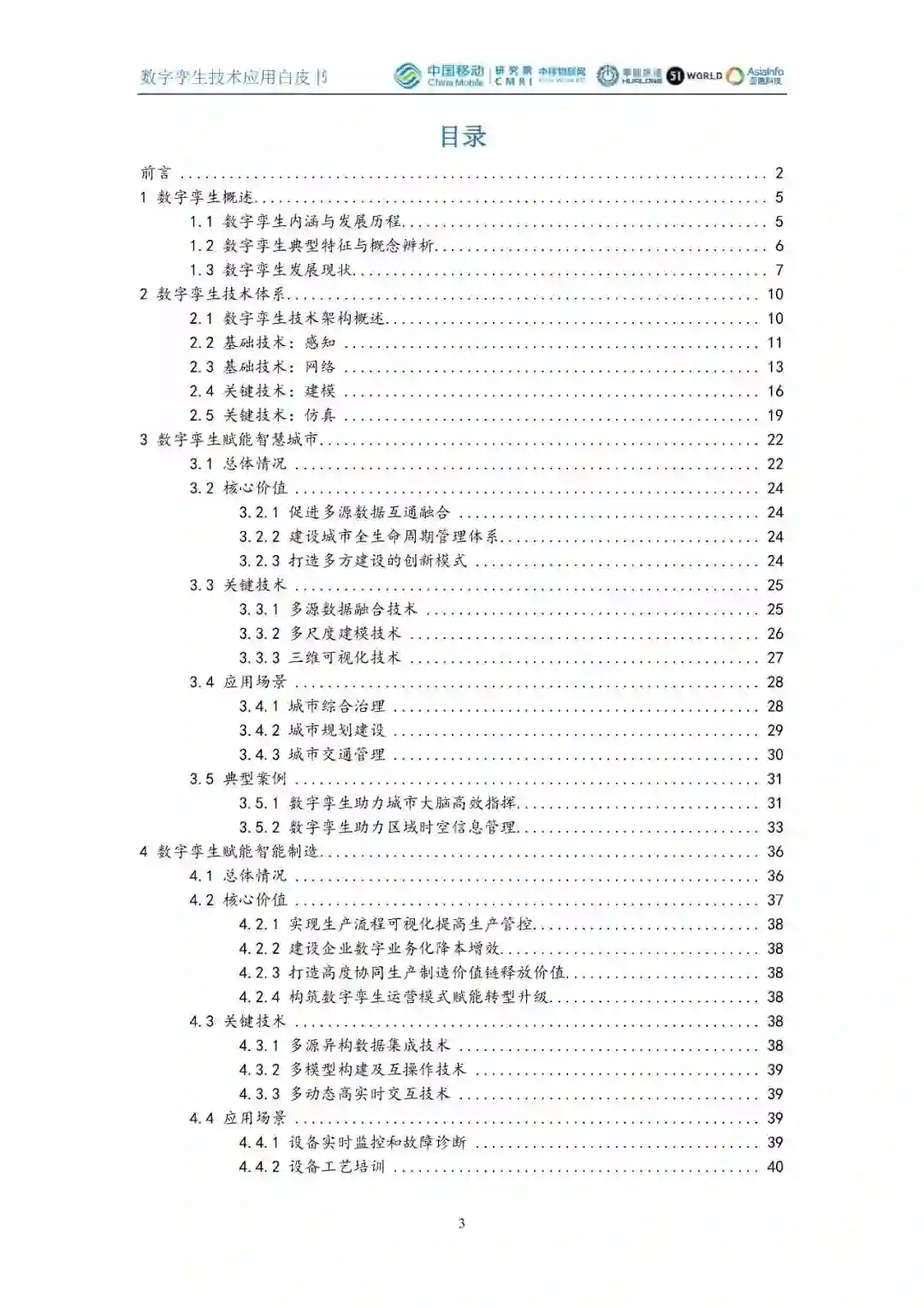 《数字孪生技术应用白皮书(2021)》聚焦数字孪生关键技术和行业应用发展,梳理数字孪生整体发展情况,深入分析技术体系和典型垂直行业应用场景,旨在为产业界在规划实施数字孪生相关应用时提供参考借鉴,助力数字孪生技术演进和产业发展。