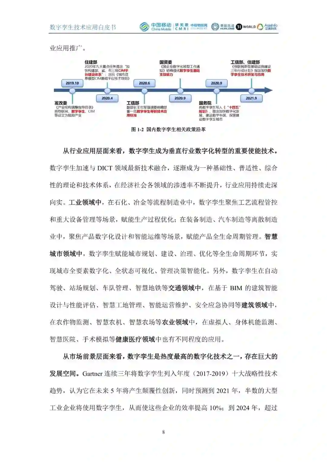 白皮书指出,从政策层面来看,数字孪生成为各国推进经济社会数字化进程的重要抓手;从行业应用层面来看,数字孪生成为垂直行业数字化转型的重要使能技术;从企业主体层面来看,数字孪生被纳入众多科技企业战略大方向,成为数字领域技术和市场竞争主航道;从标准化层面来看,数字孪生标准体系初步建立,关键领域标准制修订进入快车道。