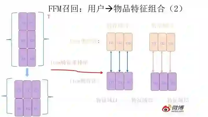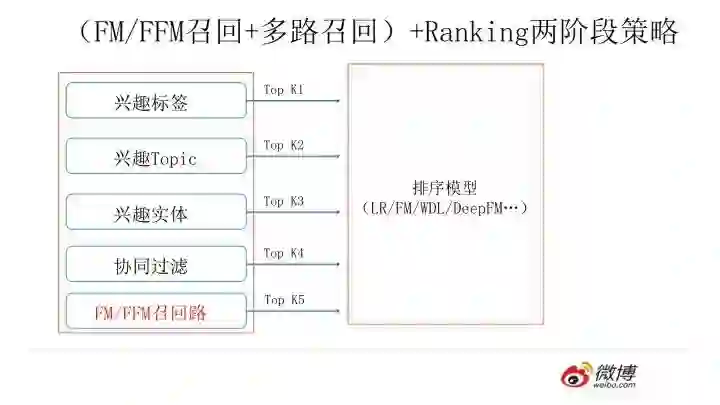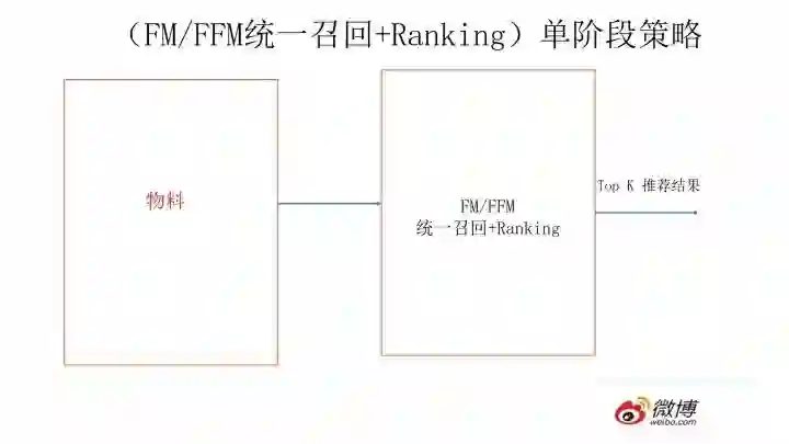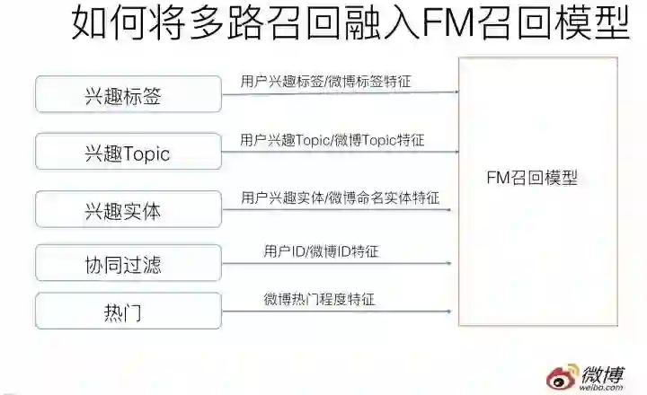 对于比如兴趣分类,兴趣标签,热门,地域等召回策略,要把这些召回渠道统一到FM/FFM模型相对直观,只需要在训练FM/FFM模型的时候,针对每一路的特性,在用户特征端和物品特征端新增对应特征即可。比如对于地域策略,我们可以把物品所属地域(比如微博所提到的地域)和用户的感兴趣地域都作为特征加入FM/FFM模型即可。兴趣标签,Topic,兴趣实体等都是类似的。所以大多数情况下,在多路召回模式下你加入新的一路召回,在FM/FFM统一召回策略下,对应地转化成了新增特征的方式。