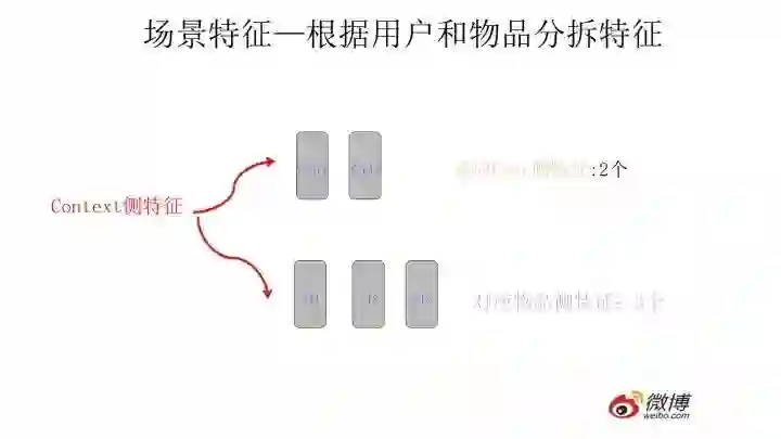 之所以把上下文特征单独拎出来,是因为它有自己的特点,有些上下文特征是近乎实时变化的,比如刷新微博的时间,再比如对于美团嘀嘀这种对地理位置特别敏感的应用,用户所处的地点可能随时也在变化,而这种变化在召回阶段就需要体现出来。所以,上下文特征是不太可能像用户特征离线算好存起来直接使用的,而是用户在每一次刷新可能都需要重新捕获当前的特征值。动态性强是它的特点。