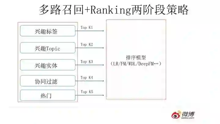 目前工业界的推荐系统,在召回阶段,一般都采取多路召回策略。上图展示了一个简化版本的例子,以微博信息流排序为例,不同业务召回路数不太一样,但是常用的召回策略,基本都会包含,比如兴趣标签,兴趣Topic,兴趣实体,协同过滤,热门,相同地域等,多者几十路召回,少者也有7/8路召回。
