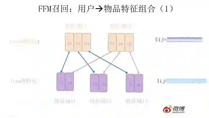 FM要想把ID特征融入,应该是可行的,因为毕竟每个特征只需要学习一个k维大小特征向量,虽然ID数量大,但是总还是能接受。但是,如果是在FFM召回模型中融入ID特征,你会发现这里有个严重的问题:因为每个特征要包含(F-1)个k维特征向量,这对于FFM来说,ID特征会有超量的参数需要学习。比如假设F=101,k=10,UID有1亿个不同ID。这意味着光UID特征,就需要1000亿参数,这个……估计你会被吓退。所以,感觉FFM是很难把协同特征引入的,除非,事先通过其它方法对ID进行协同embedding编码,在FFM中直接使用,而不作为它的参数。否则,这在参数量以及存储量上来说,是很难做到的。