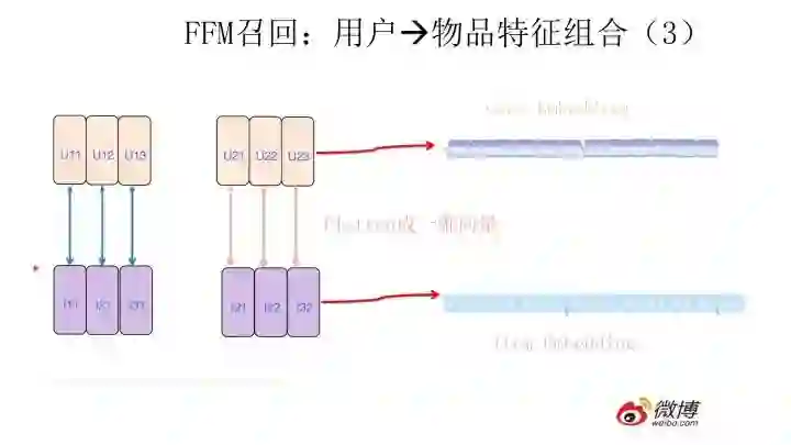 在前文我们分析过如何用FFM模型来做召回模型,你会再次发现FFM模型的特性,就是太沉重。这种“沉重性”在召回阶段,表现为:用FFM模型打出来的用户Embedding长度太长,如果用户侧有M个特征域,物品侧有N个特征域,单个特征embedding向量大小为K,先不考虑上下文特征域,打出来的用户Embedding size=M*N*K。而这个长度是很容易失控的。