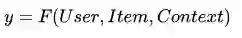 意思是,我们利用用户(User)相关的特征,物品(Item)相关的特征,以及上下文特征(Context,比如何时何地用的什么牌子手机登陆等等)学习一个映射函数F。学好这个函数后,当以后新碰到一个Item,我们把用户特征,物品特征以及用户碰到这个物品时的上下文特征输入F函数,F函数会告诉我们用户是否对这个物品感兴趣。如果他感兴趣,就可以把这个Item作为推荐结果推送给用户。