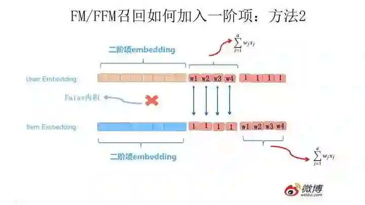 其实很简单,上图展示了一种做法,在用户侧的embedding中增加两位,第一位是属于用户特征域的特征对应的一阶项累加和,相应地,在物品侧对应位置增加一位,设置值为1,这样在Faiss求内积的过程中,就把用户侧的一阶项引入了。类似地,也可以如此加入物品侧的一阶项。