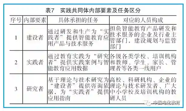 推动智能教育从系统建设到应用落地,需要多方协同、各方面力量的整合,形成协作互助、优势互补的“实践应用共同体”,合力推进智能教育的建设与应用。“实践应用共同体”建设应从外部和内部两个视角来构建,从外部视角来看,应主动对外沟通联系,协调外部的政策、人才、资金等条件,以及智能技术的引进与相关教育理念达到一定的水平等,创造良好的外部环境;从内部视角来看,应依托各种力量组建有“建设者”“实践者”“研究者”三要素构成的实践应用共同体[21]。实践应用共同体三个内部要素承担的任务及人员构成如表7所示。“建设者—实践者—研究者”三者之间协作互助、优势互补、利益攸关,它们的关系具体为:“建设者”通过研发和生产为“实践者”提供智能教育应用产品与技术服务;“实践者”通过教育实践为“研究者”提供实践案例与智能教育应用数据;而“研究者”基于理论与技术研究为“建设者”提供咨询依据,为“实践者”提供应用指南。