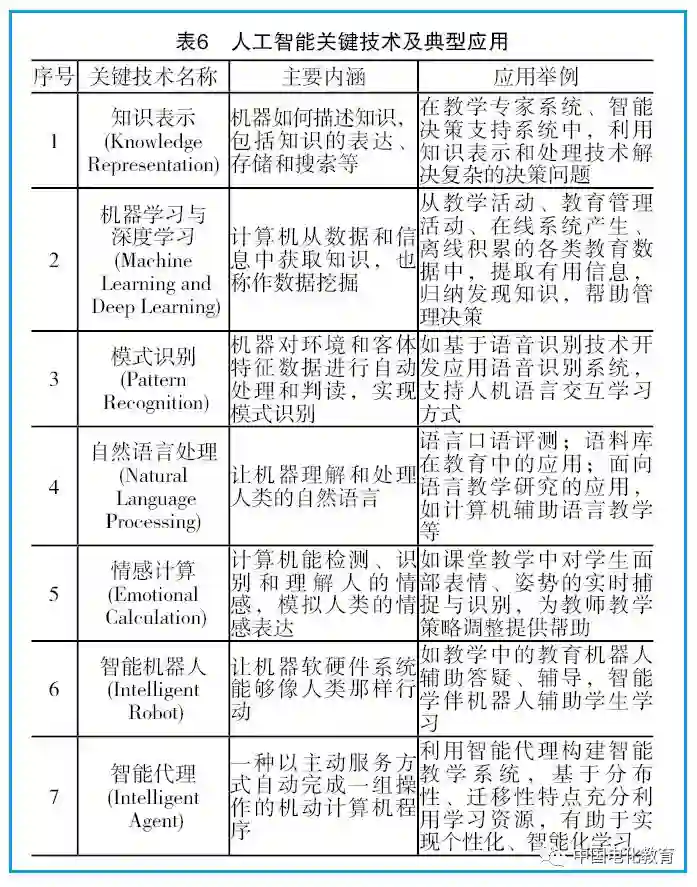 从国内的探索与实践看,在教育领域中广泛应用的人工智能关键技术主要有知识表示方法、机器学习与深度学习、自然语言处理、智能代理、情感计算,可用于智能导师、教育机器人、学习伙伴、智能测评、教育数据挖掘、学习者数字画像等教育应用[19]。本研究综合以上维度对已有专用人工智能发展及其在教育领域应用的分析,如表6所示,在纵向上是智能教育中具有潜力的人工智能关键技术,主要包括知识表示、机器学习与深度学习、模式识别、自然语言处理、情感计算、智能机器人、智能代理等类型,在横向上对其研究主要方法进行梳理,重点对其教育中的应用场景进行概括说明。