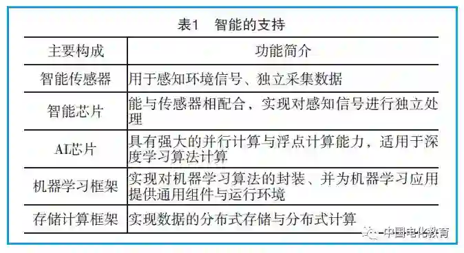 (1)支撑模块。为教育智能系统提供基础的硬件设备(如服务器、终端、传感器、芯片等)和软件环境(如各类计算框架、程序库等)的支撑,典型的软硬件基础设施如表1所示。