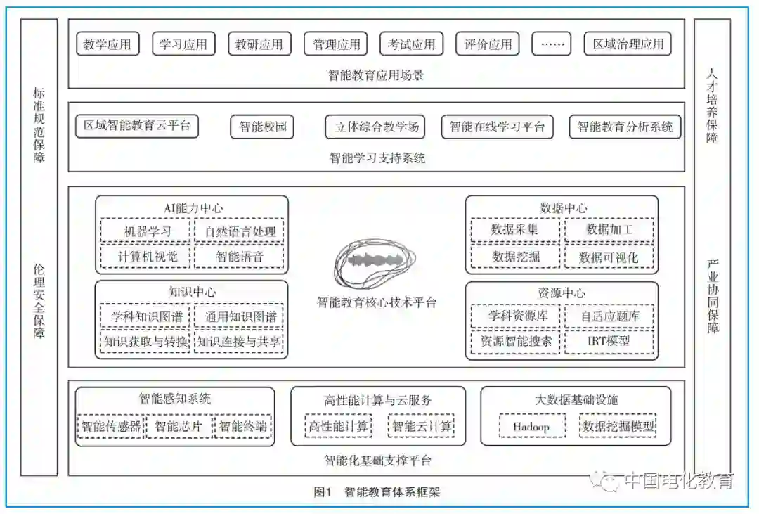 4.智能教育应用场景。智能技术在教育场景的应用是发挥智能技术价值,构建新型教育模式的必然路径。基于智能关键技术及智能学习支持系统,实现教育教学全场景的智能化应用,包括智能备课、智能授课、智能作业、智能教研等教学辅助型应用,学习路径规划、学习资源推荐、自适应学习等学习增强型应用,智能组卷、智能监考、智能评阅、智能考试分析等考试评价型应用,智能排课、智能班牌、智能安防、智能设备管理、家校互通、区域大数据治理等管理服务型应用,体质健康管理、心理诊断与康复、家教陪伴、特殊教育等身心保障型应用。