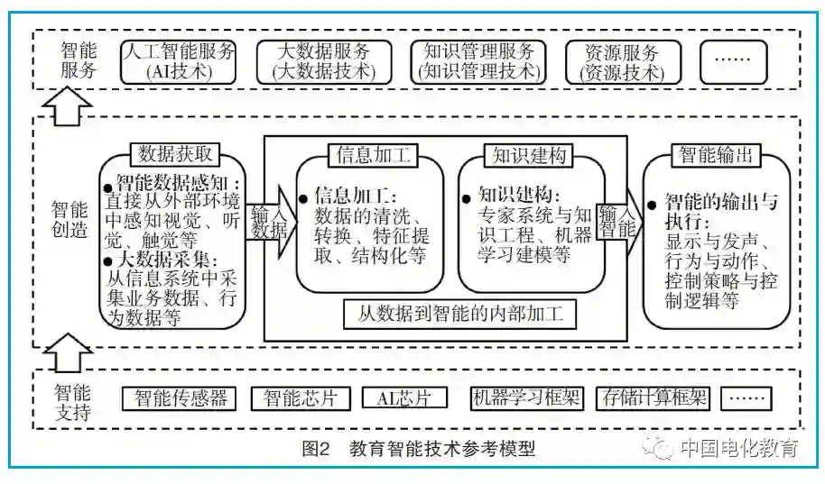 具体到教育场景中,智能技术需提供以下四类关键技术服务:实现对从环境中感知到的信号、符号、素材等原始数据的处理,需要人工智能关键技术;对大量原始数据进行清洗、加工,并整理成为结构化数据即有用的信息,需要大数据关键技术;从信息中提炼、加工、体系化并形成知识,需要知识管理关键技术;原始数据、信息、知识、智能的存在与使用都离不开物理和信息载体等资源支持,需要资源关键技术。