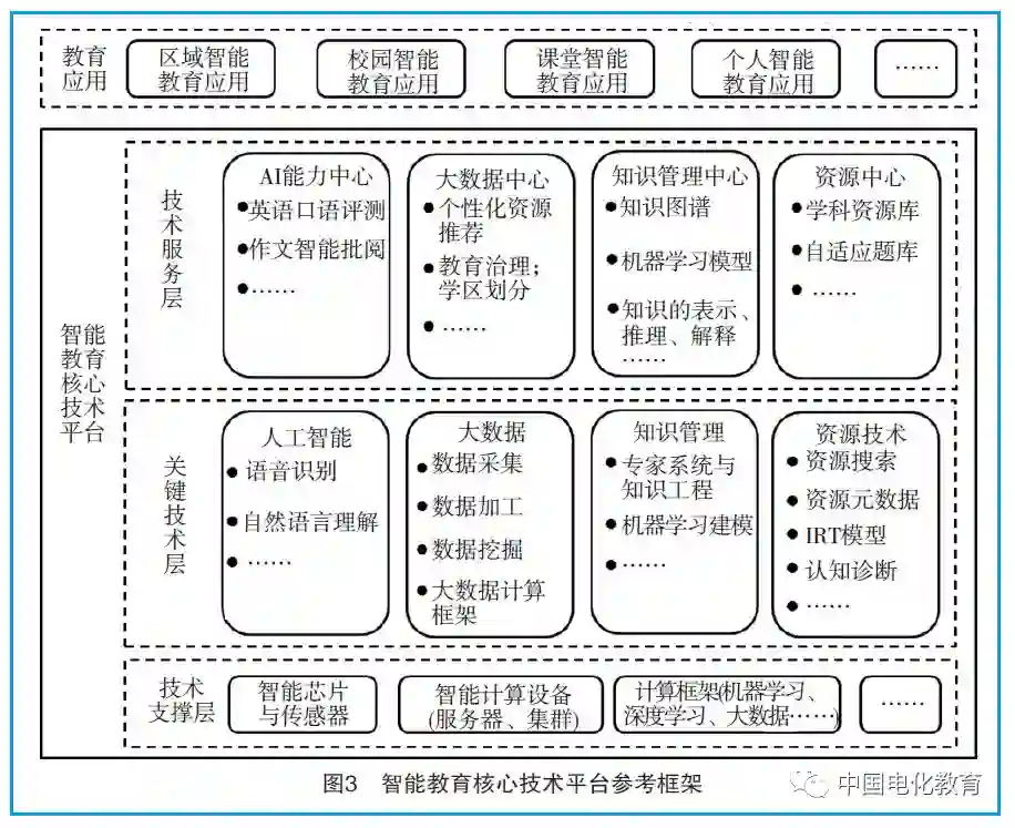 核心技术平台整合了相关智能技术,提供功能服务的集中输出,在整个智能教育体系中处于核心的技术引擎地位,实现了技术为应用系统赋能,使应用系统也具备了智能能力。核心技术平台并非只是对纯技术的简单封装,而是以教育领域用户核心需求为导向。基于平台的多层体系架构,人工智能、大数据等关键技术,由于与具体的教育业务场景关联度较低且技术应用门槛较高,被封装在平台的底层,作为对上层应用服务的支撑,而不能被用户直接访问;而将能够解决具体教育业务场景中用户真实需求、自带业务逻辑的关键技术应用,封装为技术服务,向平台外部用户开放,以支撑各类教育应用。