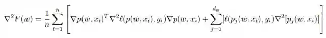 其中是关于第一个参数的损失函数 l(·, ·) 的海塞矩阵,∇p(w, xi) 是 dy-维函数 p(w, x) 对于权重 w 的雅可比式,∇^2 [pj (w, xi)] for all j ∈ {1, . . . , dy} 是关于 w 的按元素运算的海塞矩阵。