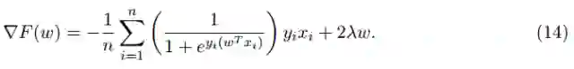 这一类中包含很多机器学习模型,包括支持向量机、Lasso(Least Absolute Shrinkage and Selection Operator)、稀疏逆协方差选择等。有关这些模型的详细信息请参见 [86] 和其中的参考文献。为了每一步都能具体(展现出来),此处我们指定以二分类的正则化logistic回归为例(进行讲解)。为了简化例子中的符号,我们作不失一般性的假设,令。(此处省去了偏置项 b0),这一省略操作可以通过在输入向量上增加一维恒为 1 的特征值来弥补)。当 w 和 x 都是 d 维时就可以令其为特定的凸优化问题。