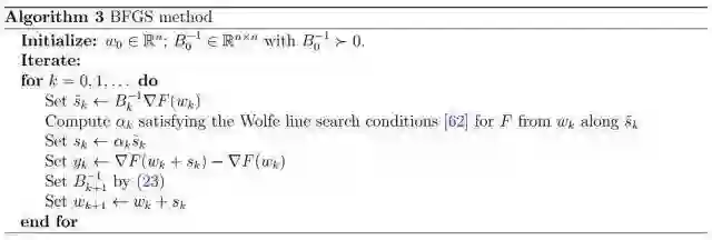 有趣的是,这些方法没有计算出显式二阶导数,而是通过在每次迭代中应用低秩更新构造完全由一阶导数的海塞近似矩阵。例如,让我们简要介绍最流行的拟牛顿算法,全称为 Broyden-Fletcher-Goldfarb-Shanno(BFGS)方法。在这种方法中,我们首先可以看到(21)的最小值为、进一步发现它实际上可以方便地计算出逆 Hessian 近似。由于